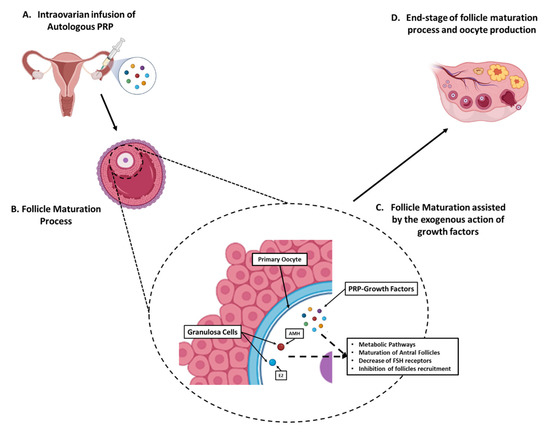 Proposed model of intraovarian rejuvenation utilizing the autologous PRP. (A) Initially, the ultrasound-assisted intraovarian administration of autologous PRP was performed to the patients of all groups. (B) The PRP-contained growth factors can positively influence the follicle maturation process. (C) During the preantral and antral stages, the PRP-growth factors e.g., PDGF, TGF-β, VEGF, HGF, IGF, and EGF can assist in hormone balance restoration, through implication to metabolic pathways, hence resulted to increase in AMH and E2 levels and in parallel the decrease in FSH and LH levels. Moreover, the increase in AMH results to further follicle maturation, decrease in FSH receptors and inhibition of follicle recruitment from the resting reservoir. (D) Finally, the antral follicles successfully maturated and ovulated, resulting to the end-stage follicle maturation process with the production of a functional oocyte.