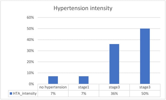 The analyzed patients are between 40 and 93 years old. Half are between 63 and 79 years old. In the sample of patients, 53% are women and 47% are men. We did not introduce these variables as clustering dimensions because we wanted to consider only comorbidities. Figure 1 shows the proportion of comorbidities in patients, and Figure 2 shows hypertension intensity. The blue bars, with 1, reflect the percentage of patients having that comorbidity, and the orange bars, with 0, reflect the percentage of patients who don’t.