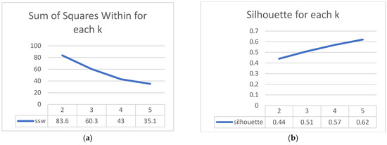 In Figure 4a it can be seen that as k increases, the dissimilarity in the clusters starts to decrease, and the patients become more similar. For example, from k equal 4 to k equal 5, you do not gain much divided variance, as this is a decrease of only 19% compared to 28% from k equal 2 to k equal 3. To have another criterion for choosing k, the silhouette metric is also analyzed, which can be between −1 and 1, where 1 shows a perfect separation between clusters. This is based on the distances between the objects to other objects in the same cluster and, respectively, to objects in the other clusters.