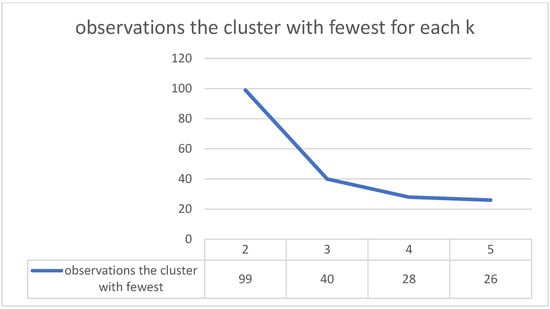 Figure 5 shows the evolution of the number of observations from the cluster with the fewest observations for each k. So, if we split the patients into two clusters, the cluster with the fewest observations has 99; if we split them into three clusters, the cluster with the fewest has 40, and so on. It is relevant to measure this because, for each k, we have an idea concerning the risk of having too few observations in a cluster. It can be seen that with k equal to 3, we have 40 patients in the smallest cluster, and in the analysis with 4 clusters only 28 patients remain. The sum of squares within and silhouette metrics would suggest that 4 clusters would have more similar observations and, thus, a better representation of patterns than 3 clusters. There is not, however, a very big difference between the performance of these two scenarios, with 3 and 4 clusters, respectively, and in the case of 5 clusters, performance would remain similar. The number of observations for 3 clusters is much better than with 4 clusters, where there is a greater risk of not representing those clusters well. Considering these and the ease of interpreting 3 clusters instead of 4, we choose to divide the patients into 3 clusters.