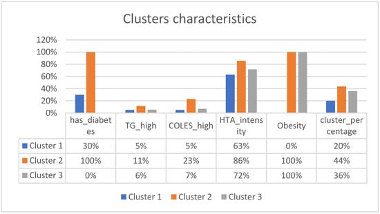 Clustering using variables in different scales is challenging. The use of binary variables for triglycerides and cholesterol was preferred to be on the same scale as the other variables. There was also the option of normalization with values between 0 and 1, although, from a medical perspective, it makes more sense to show whether a patient has the value after a certain threshold for these variables. For the diabetes variable, the patients with diabetes were in different stages: some were only following the diet (26%), some were taking antihyperglycemic drugs treatment (48%), and the rest were on insulin treatment (26%). Regarding the variable hypertension intensity, the range from 0 to 1 was divided equally according to the stages. Thus, the distance between a patient without hypertension and a patient with hypertension stage 1 was the same as the distance between a patient with stage 2 and a patient with stage 3. This method was preferred considering the number of patients in the sample and the ease of interpreting the results.