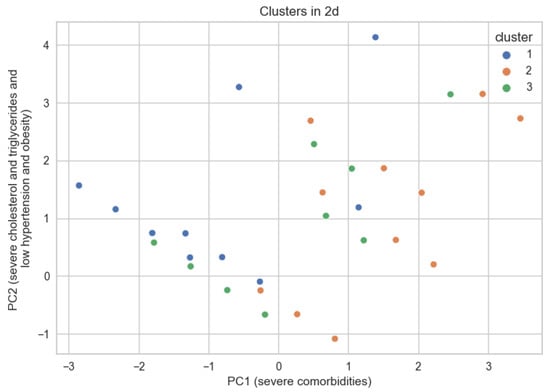To better understand the patients and how they are divided into the 3 clusters, the following image was created. The patients were represented in 2d, starting from the dimensions related to comorbidities, and the first two principal components were extracted using Principal Component Analysis-Figure 7.