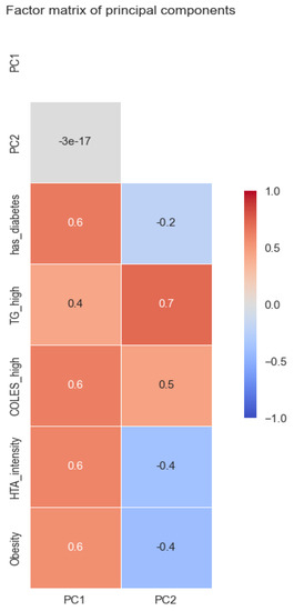 The factor matrix shows the Pearson correlation of the new components with the original variables. These two extract the maximum information from the original variables. It can be seen how PC1 is moderately correlated with all variables. Thus, we can interpret that the higher PC1 is, the worse a patient is. Regarding PC2, there is a strong correlation with high triglyceride and a slight correlation with high cholesterol, but also a slight inverse correlation with hypertension intensity and obesity. With higher PC2, the patient tends to have high triglycerides and high cholesterol but also lower hypertension and obesity, although there are smaller correlations.