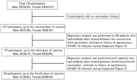 Of the 133 enrolled patients (49 males, 84 females) whose SARS-CoV-2 antibody titers were measured at the Ekawa Medical Clinic, 127 patients (48 males, 79 females) were vaccinated up to the second dose, 97 patients (35 males, 62 females) up to the third dose, 53 patients (21 males, 32 females) up to the fourth dose, and 6 had never been vaccinated. The mean and median age tended to increase with the number of vaccinations. Of the 127 patients vaccinated up to the second dose, 115 patients and 1 patient received the BNT162b2 (BioNTech and Pfizer) and mRNA-1273 (Moderna and Takeda) vaccines, respectively. Of the 97 patients vaccinated up to the third dose, 65 patients and 30 patients received the BNT162b2 and mRNA-1273 vaccines, respectively. Of the 53 vaccinated up to the fourth dose, 39 and 11 patients received the BNT162b2 and mRNA-1273 vaccines, respectively (Table 1, Figure 1).