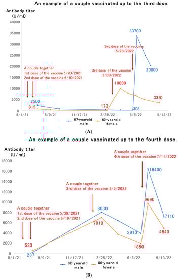 First, we showed typical antibody titers trends in married couples who were vaccinated with COVID-19 vaccines, after the third and fourth doses.
