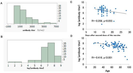 The results are expressed as mean ± standard deviation (SD). The Pearson’s product-moment correlation coefficient was used to assess the associations between log-transformed SARS-CoV-2 anti-receptor binding domain IgG antibody titers, age, and number of days after vaccination. The normality of the distribution was assessed by the Shapiro–Wilk test, and the transformation to fit a normal distribution was applied to the antibody titers (U/mL) and log-transformed antibody titers. For data analysis, the JMP 13.1 software was used. Statistical significance was set at p < 0.05.