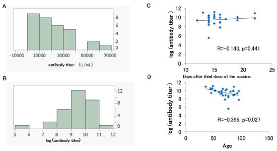 Histograms of the antibody titers (A) and log-transformed antibody titers (B) for 31 participants who had been vaccinated up to the third dose. Correlation between the days after the third dose and the log-transformed antibody titer (C). Correlation between the participant’s age and the log-transformed antibody titer (D).