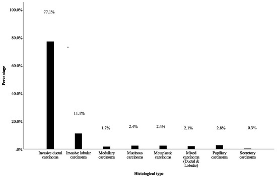 Invasive ductal carcinoma was the most common histologic type of BC (77.1%) followed by invasive lobular carcinoma (11.1%) and papillary carcinoma (2.8%) (Figure 1). The representative picture of each histological type is shown in Figure 2.