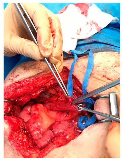 Roux-en-Y hepaticojejunostomy (RYHJ) is currently the most commonly utilized procedure for the establishment of biliary–enteric continuity after any type of resection of the extrahepatic biliary tree. Technically, a long jejunal hepatic limb, of up to 75 cm and no less than 40 cm, should be the goal in order to decrease the risk for enterobiliary-reflux-causing cholangitis. The literature reports a rise the efficiency of the procedure of up to 90% [2,5]; however, the most dismal long-term complication associated with the procedure is the development of stenosis with an incidence ranging from 5 to 38% [6]. As long as the diagnosis of stenosis is confirmed, treatment should be prompt and definite in order to prevent the dismal consequences of the obstructed bile outflow, such as choledocholithiasis, recurrent cholangitis, liver abscess formation, secondary biliary cirrhosis, and ultimately, portal hypertension [7]. First line treatment options include the dilation or the stenting of the stricture via either the transhepatic route or endoscopy [8,9]. Along with interventional radiology and endoscopy, surgery is also an integral part of the treatment algorithm as it is required, usually as the last resort, in about 25% of patients [8,9].