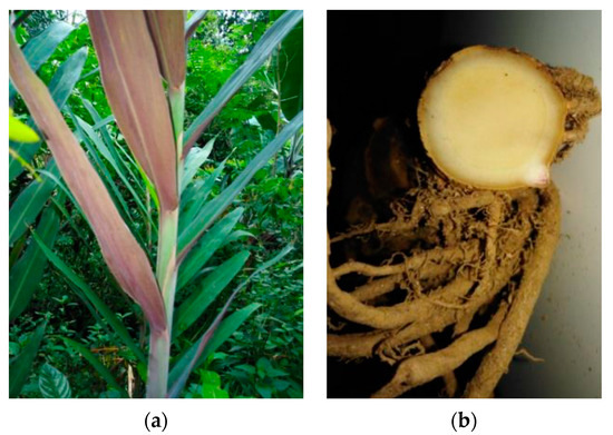 The aerial stem was a pseudo-stem consisting of a leaf sheath approximately 3.08 m in height. The leaves were simple, alternate, oblong, entire and acute at the base and apex of the plant with a very short petiole; the underside of the leaves was purple. The rhizome had a strong aromatic smell with conspicuous nodes and internodes. The rhizomes were characterized externally by a dark reddish-brown color, and cuttings of the inner rhizome were characterized by the presence of a dark center surrounded by a wider and paler layer on the outer rim (Figure 1).