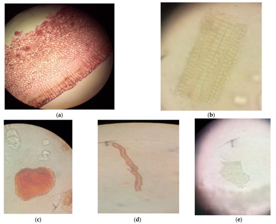 For powder microscopic studies, a few drops of chloral hydrate solution were added to a sample of powdered plant material on a slide and heated gently over a micro-Bunsen. The slide was covered with a glass cover slip for examination under the microscope, and different cell components were observed. The microscopic evaluation was supplemented with photomicrographs of different magnifications obtained using a Leica light microscope DM 1000 LED (Leica Microsystems CMS GmbH, Wetzlar, Germany).