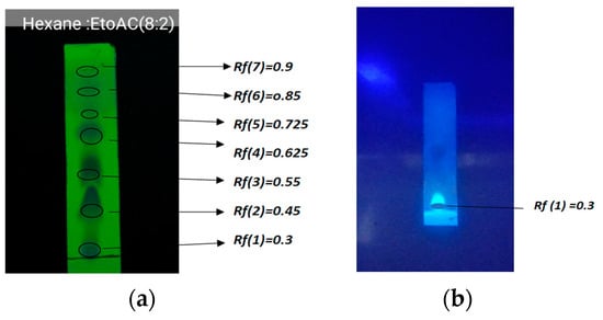 TLC results for the hexane galangal extract. (a) TLC galangal extract under the UV 254 lamp. (b) TLC under the UV lights, 360 nm.