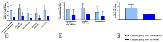 At the start of the treatment, the subjects of the cineole group were affected rarely or sometimes by all nine assessed symptoms (see Supplementary Table S6). Upon treatment, the impact of the disease on all assessed symptoms decreased significantly (p < 0.001; see Figure 1c). In the cineole group, the sum score of the impact decreased by 53.9%, i.e., from 13.31 ± 6.78 to 6.13 ± 5.71, whereas the sum score in the nasal spray group decreased by 45.3%, i.e., from 10.38 ± 6.95 to 5.68 ± 5.37 (see Figure 2).