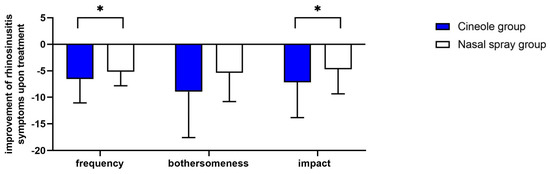 Decreases in sum scores of the frequency, bothersomeness, and impact of rhinosinusitis symptoms upon treatment with cineole capsules or nasal spray. Data are presented as mean + SD. * p < 0.05.