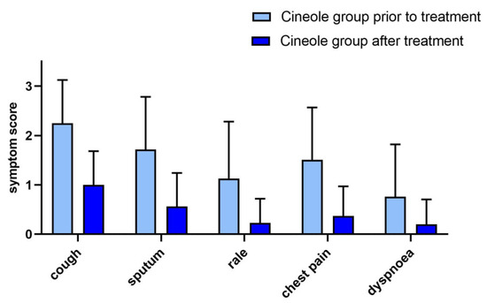 Of the 310 subjects in the cineole group, 68 (21.9%) reported the presence of bronchitis symptoms at the start of the survey. All five bronchitis symptoms (cough, sputum, rale, chest pain when coughing, and dyspnoea) improved significantly (p < 0.001) upon treatment. Namely, the mean score of cough decreased from 2.25 ± 0.88 to 1.00 ± 0.68, the mean score of sputum from 1.72 ± 1.06 to 0.56 ± 0.68, the mean score of rale from 1.13 ± 1.15 to 0.23 ± 0.49, the mean score of chest pain from 1.51 ± 1.06 to 0.37 ± 0.60, and the mean score of dyspnoea from 0.76 ± 1.06 to 0.2 ± 0.50 (see Figure 3). The bronchitis sum score decreased significantly (p < 0.001) by 69.4%, i.e., from 7.22 ± 4.30 to 2.31 ± 2.35.