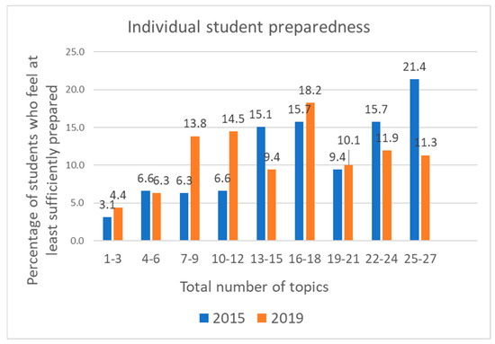 The percentage of students who felt sufficiently prepared for more than 89% (24 out of 27 questions) of the topics was almost twice as high in 2015 than in 2019 (Figure 1).