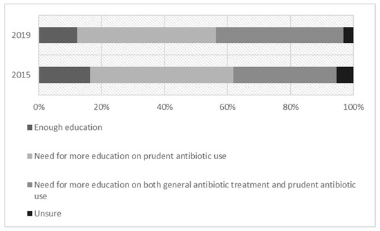 The majority of surveyed students in both years reported feeling the need for additional education on antibiotic use for their future work (78.0% vs. 83.0%; p = 0.199) (see Figure 2). The results did not vary significantly between the four universities in 2015 (72.2–81.4%) or in 2019 (73.7–100%).