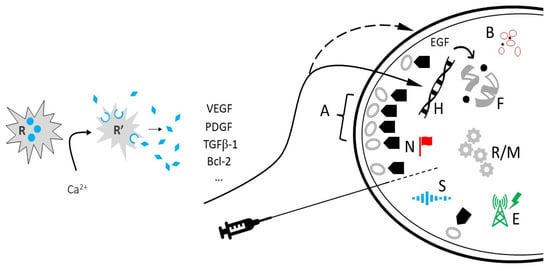 Fresh autologous platelets (R) are activated (R′) via calcium-based reagent, discharging numerous platelet-derived growth factors and cytokines available for intraovarian injection. EGF can exert a stabilizing effect on telomeres (F), and angiogenesis (B) promoted by VEGF permits general tissue support via improved perfusion. Regulators of HOX loci (H) may include upstream PRP elements, but stemness traits are partially under TGF-β1 control [38]. PRP components coordinate post-translational modifications, such as N-glycan biosynthesis (N) and optimization of SIRT3 (S), as well as improving mitochondrial/ribosomal metabolism (R/M). Ion channel regulation (E) may be an additional role for intraovarian PRP. While operating independent of latent subcapsular ovarian stem cells (A), PRP may deliver secondary actions (