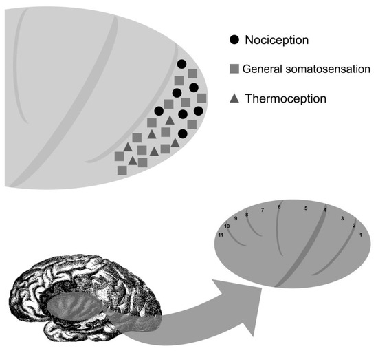 The primary somatosensory area (SI), secondary sensory area (SII), and insula are the main cortical areas responsible for producing somatosensory perceptions (Figure 1). According to Penfield and Jasper, auras originating from the primary sensory area do not differ in character from those originating from the secondary sensory area. However, some patients in the latter group reported cold sensations [22]. However, Mazzola et al. revealed that paresthetic, pain, and thermal sensations could be elicited from all three areas [23]. Furthermore, upon stimulation of the insular cortex, non-somatosensory responses, such as auditory, gustatory, vegetative, etc., could be evoked [23,24].