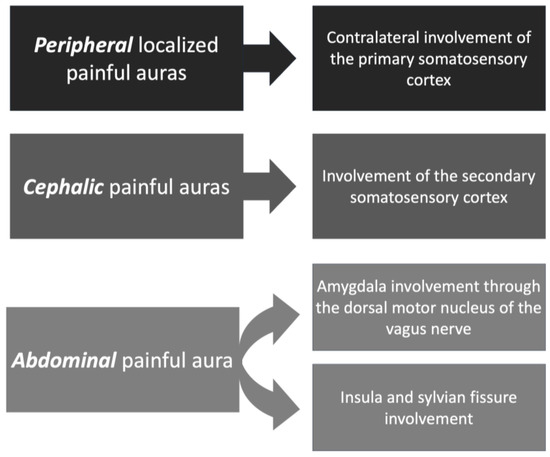 As for the source of painful auras involving the abdomen, the amygdala was found to communicate with the gastrointestinal system through the dorsal motor nucleus of the vagus nerve [65]. Other studies have speculated on the role of the insula and Sylvian fissure in the development of viscerosensory auras. However, conclusive evidence of the etiology of painful auras is yet to be explored [66].