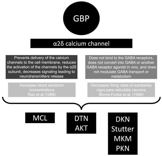 Schematic diagram of the pathophysiological mechanism for gabapentin (GBP)-associated movement disorder. AKT, akathisia; DKN, dyskinesia; DTN, dystonia; GABA, gamma-aminobutyric acid; MCL, myoclonus; MKM, myokymia; PKN, parkinsonism [119,120].