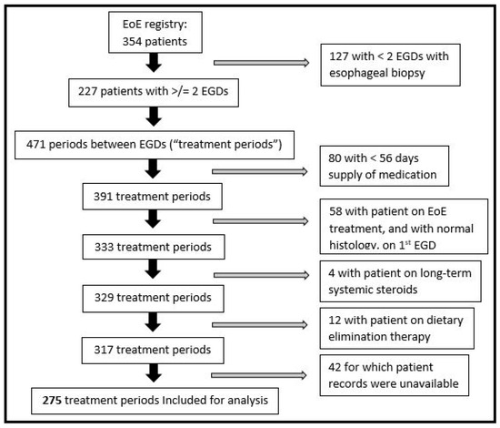 - Kolasinski, N.T.; Pasman, E.A.; Nylund, C.M.; Reeves, P.T.; Brooks, D.I.; Lescouflair, K.G.; Min, S.B. Higher Medication Possession Ratio Correlates with Improved Outcomes in Eosinophilic Esophagitis. Gastroenterology 2021, 160, S-260. [Google Scholar] [CrossRef]