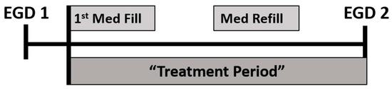 The number of treatment periods, defined as any period between 2 EGDs in which a treatment for EoE was rendered, was then determined (Figure 2). As EoE is a chronic condition and patients with EoE may have multiple endoscopies over the course of their lives, each patient had the potential to generate multiple treatment periods for analysis. In the case of successive treatment periods corresponding to the same patient, the latter treatment period was excluded from analysis if the patient achieved histologic remission in the former treatment period. Treatment periods were excluded if the patient had a <56-day (<8 weeks) supply of medication, if the baseline EGD for the treatment period had normal histology, if the patient was on diet elimination therapy or systemic steroids, or if medical records were unavailable (Figure 1). A minimum 56-day (8 week) supply of medication was selected as the consensus viewpoint in that, if a patient with EoE is to achieve histologic remission on a given therapy, they will do so after ≥8 weeks of treatment [25]. Lastly, despite the robustness of the MHS medical record system, it does not extend in full to remote duty stations; thus, treatment periods during which active duty military personnel were receiving care while stationed abroad and/or in austere environments were not included for analysis, as their prescription data was not entirely verifiable.