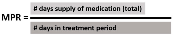 - Sperber, C.M.; Samarasinghe, S.R.; Lomax, G.P. An upper and lower bound of the Medication Possession Ratio. Patient Prefer. Adherence 2017, 11, 1469–1478. [Google Scholar] [CrossRef]