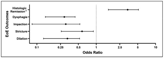 For any treatment, the optimal MPR that correlated with histologic remission was 0.7 (Sen 0.66, Spec 0.62, AUC 0.63) according to Youden’s index in conjunction with receiver operating characteristic analysis (Figure 4). With MPRs ≥ 0.7, there were significantly increased odds of histologic remission (odds ratio 3.05, 95% confidence interval 1.79–5.30), and significantly decreased odds of dysphagia (OR 0.27, 95% CI 0.15–0.45), food impaction (OR 0.26, 95% CI 0.11–0.55), stricture occurrence (OR 0.52 95% CI 0.29–0.92), and esophageal dilation (OR 0.29, 95% CI 0.15–0.54) (Figure 5). As the amalgamated “any treatment” treatment period group had the highest power, ROC analysis was not performed for each specific treatment group.
