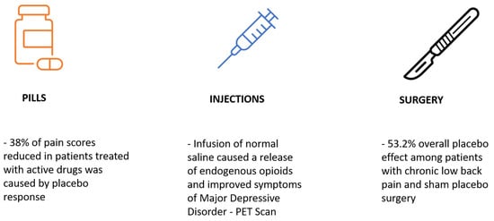 There is another aspect to consider that may amplify the results of a more intensive placebo intervention: to receive an injection or undergo a procedure, a patient is putting themselves through a certain amount of pain, investing more of themselves in their outcome than simply swallowing a pill []. Additionally, it has been noted that patients believe that if they undergo a procedure, this direct physical alteration of their body will result in a significant change in functioning. Whether or not this is true, the belief itself produces relief []. This hierarchy is supported by the study by Kaptchuk et al., exploring sham acupuncture, finding that those who received sham acupuncture reported a greater reduction in arm pain compared to those receiving a placebo pill [].