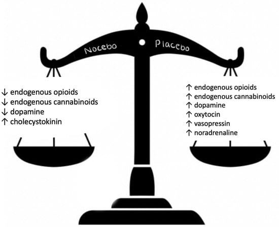 Additionally, studies addressing the biological mechanisms behind nocebo hyperalgesia, have illustrated through neuroimaging and pharmacological studies that nocebos have the power to activate cholecystokinin and inhibit endogenous opioids, cannabinoids, and dopamine (Figure 3) [,].