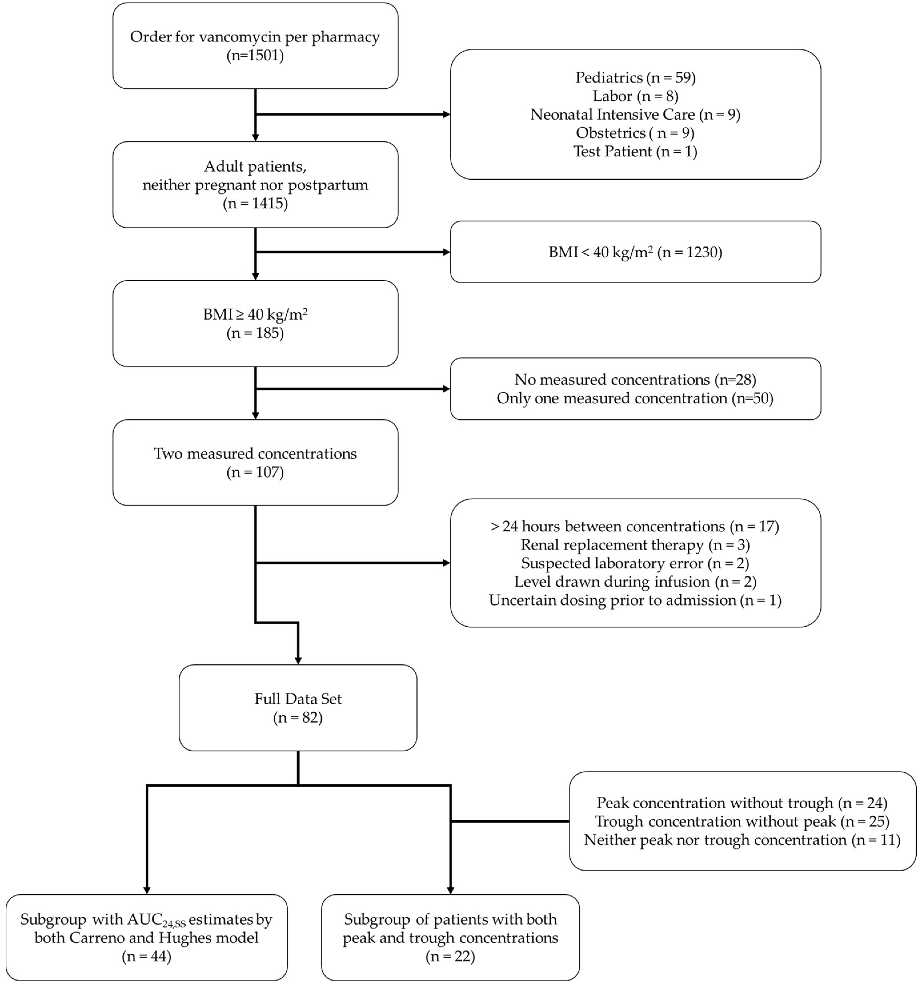 Patients were eligible for inclusion if they received an order for “vancomycin per pharmacy” after implementation of the new protocol in February 2021 but before end of data collection on 28 February 2025. Patients in the pediatric, obstetric, labor, or neonatal intensive care units were excluded. Other exclusion criteria included BMI < 40 kg/m2, fewer than two vancomycin concentrations measured, renal replacement therapy, transfer from an outside facility with uncertain dosing prior to admission, suspected laboratory errors, levels drawn during vancomycin infusion, or greater than 24 h between measured concentrations.