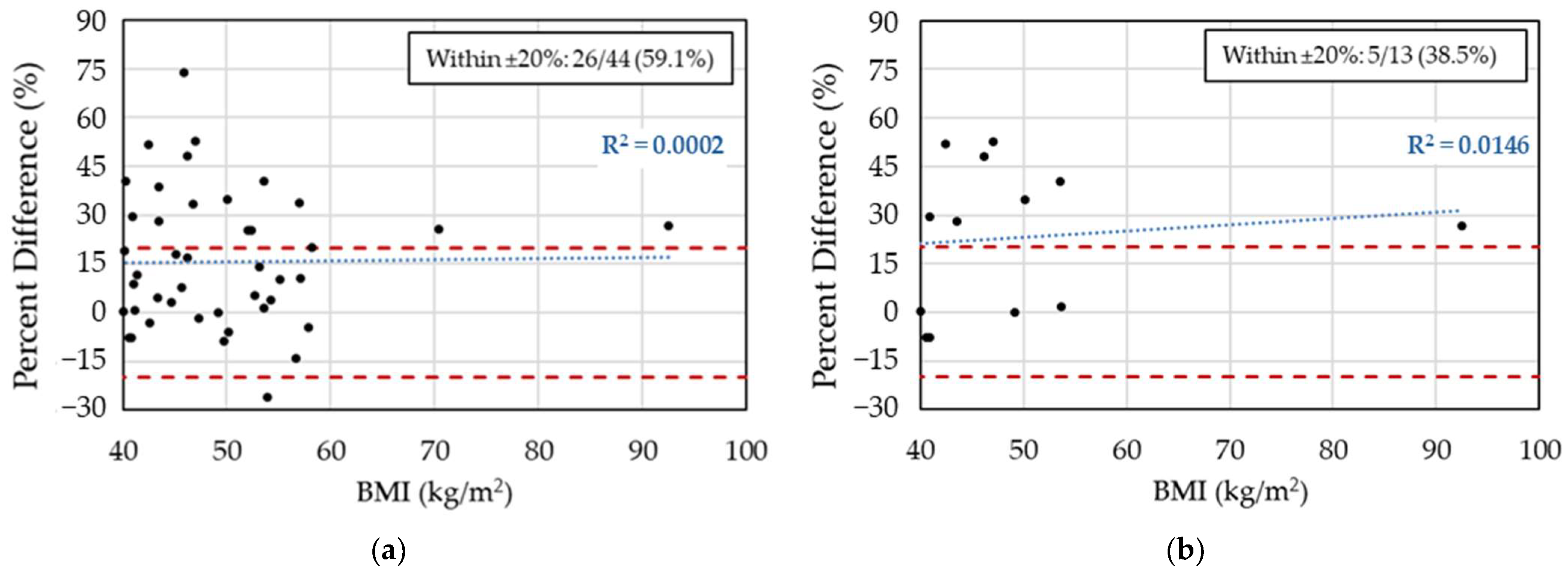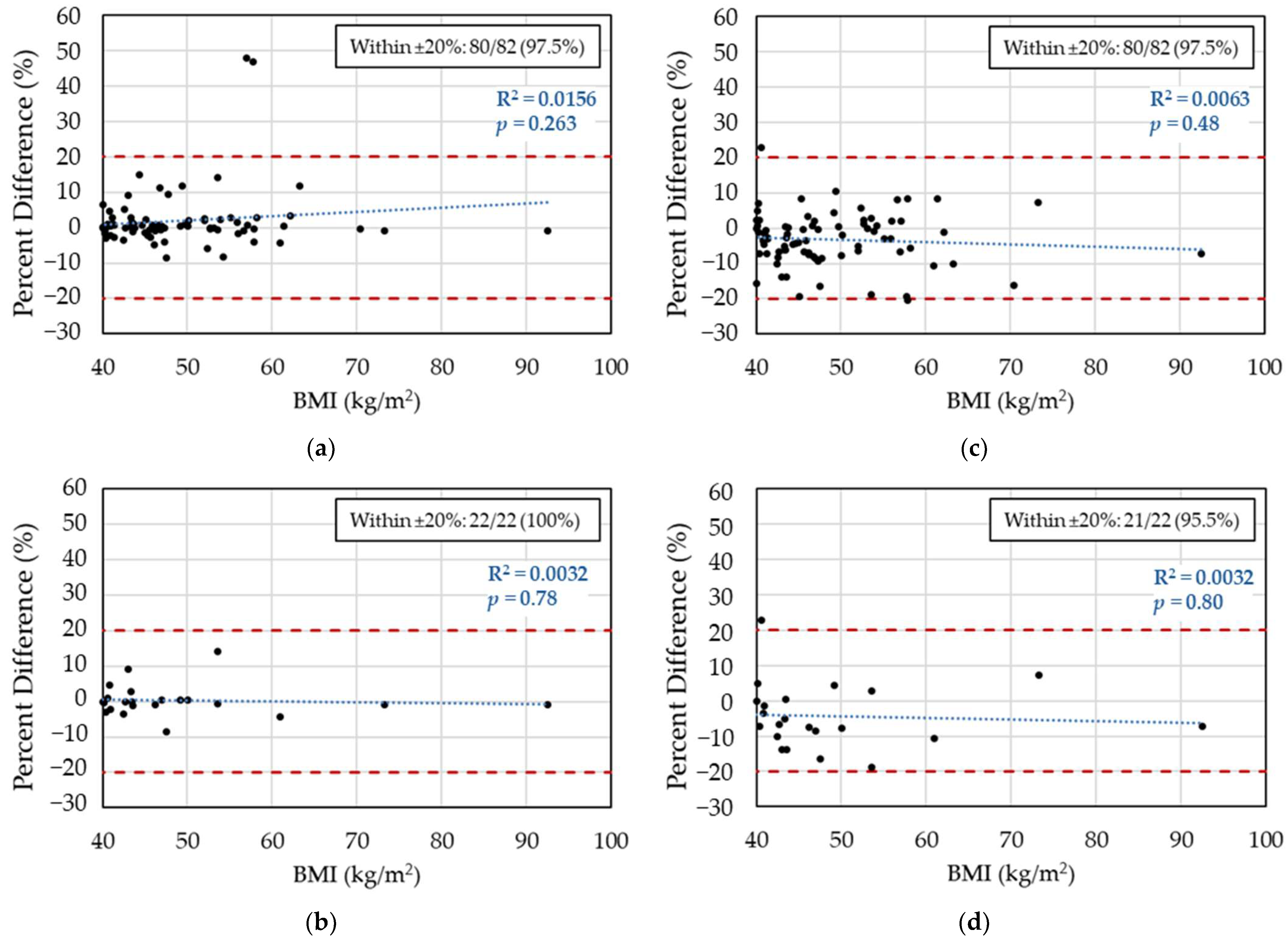 Once again, linear regression analysis revealed no apparent relationship between percent difference and patient BMI with a