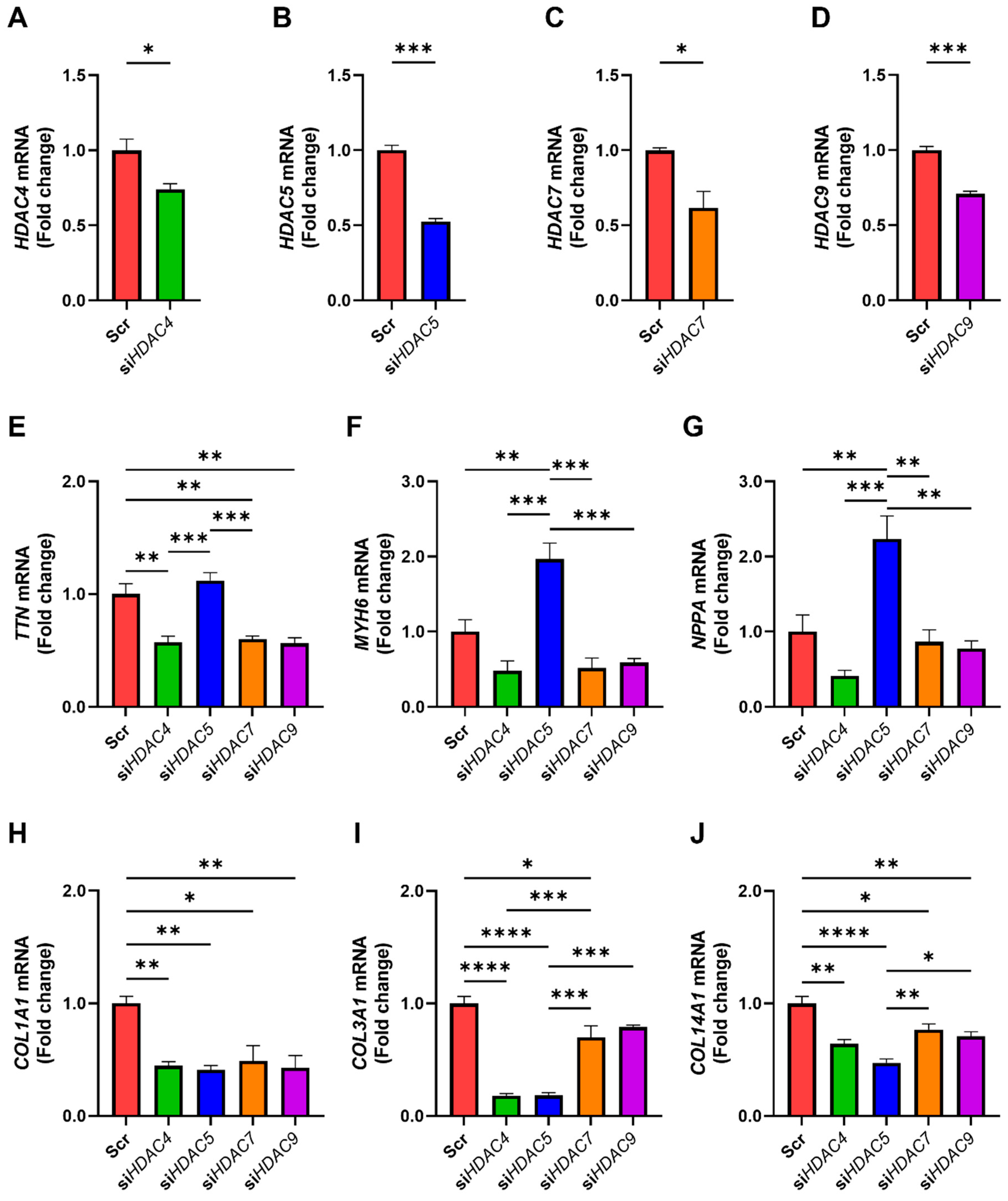 3.5. HDAC5 Inhibition Promotes Cardiac Functional Gene Expression and Suppresses Fibrosis-Associated Genes