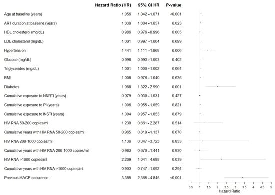 Among targeted variables, the onset of MACEs was also significantly associated with greater age at baseline and years on ART, hypertension, diabetes, lower HDL, and higher triglycerides, as described in Forrest Plot in Figure 1.
