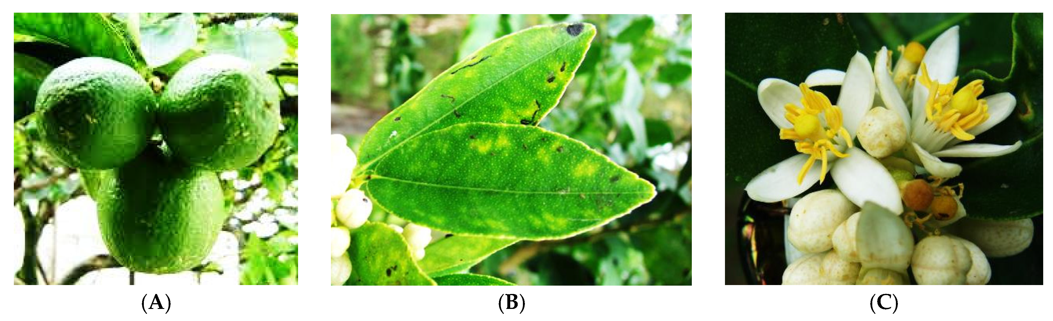 The (A) fruit; (B) leaf; and (C) flower of C. aurantifolia. (Photos credit: Forest Starr and Kim Starr).