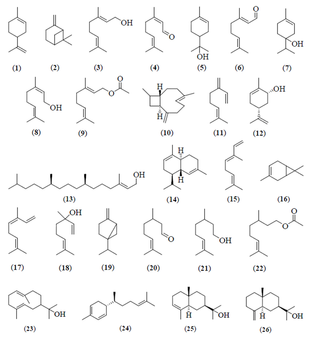 The essential oil of C. aurantifolia peels from Masjid Tanah, Melaka, was reported to contain limonene (1) (39.3%), β-pinene (2) (28.4%), geraniol (3) (7.5%), neral (4) (5.3%), α-terpineol (5) (2.4%), geranial (6) (2.1%), and terpinen-4-ol (7) (2.0%) (Table 1) [3]. Geranial (6) (19.4%), limonene (1) (16.4%), neral (4) (11.4), nerol (8) (9.5%), geraniol (3) (7.5%), geranyl acetate (9) (6.6%), and β-caryophyllene (10) (5.7%) (Figure 2) were the major compounds in the essential oil of the leaves of C. aurantifolia [3].