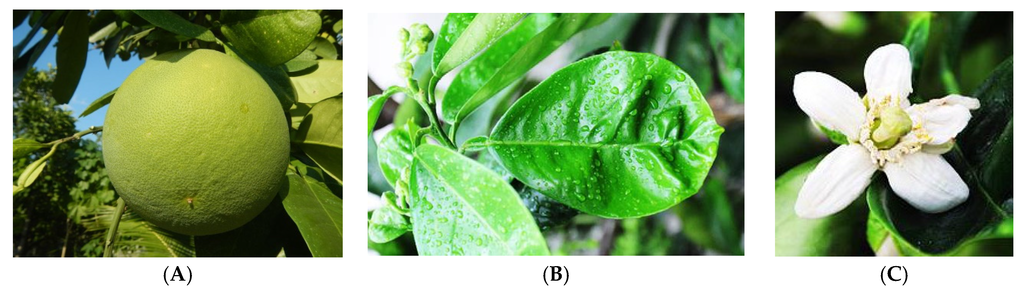 Citrus grandis L. (synonyms: C. decumana L. and C. maxima Merr.) (Figure 3) is one of the most popular fruits in Malaysia, especially in Tambun, Perak. It is native to Malaysia, and also other countries including Bangladesh, India, Indonesia, Philippines, Thailand, and Vietnam, and grows widely in Malaysia on the tailings of tin mines. In Malaysia, C. grandis has a variety of local names, such as ‘limau bali’, ‘limau abong’, ‘limau besar’, ‘limau betawi’, ‘limau bol’ and ‘limau jambua’. This plant is also known as ‘pumelo’ or ‘pummelo’, with a height of 5–15 m, and the thickness of this plant is 10–30 cm. The leaves of pumelo are dotted, glandular, alternate, ovate and elliptic, 5–20 cm long and 2–12 cm thick. The fruits of pumelo are pear-shaped with a width of 10–30 cm and pale-yellow or greenish yellow color [13,14]. C. grandis is well known for its therapeutic values; it can cure fever, gout, arthritis, kidney disorders and ulcers [15]. The fruit pulp and peels are used as an appetizer, stomach-tonic, and also for the treatment of inflammation and cough. The fruit juice has potential in influencing weight loss and promoting cholesterol reduction. In addition, C. grandis fruits are also used in the food, cosmetic, perfume and pharmaceutical industries as a flavoring or fragrance-enhancing agent [16]. The essential oil from the fruits and the leaves of C. grandis is used as one of the components of various toiletry products. Highly aromatic character of its flowers is routinely exploited by perfume manufactures [14].