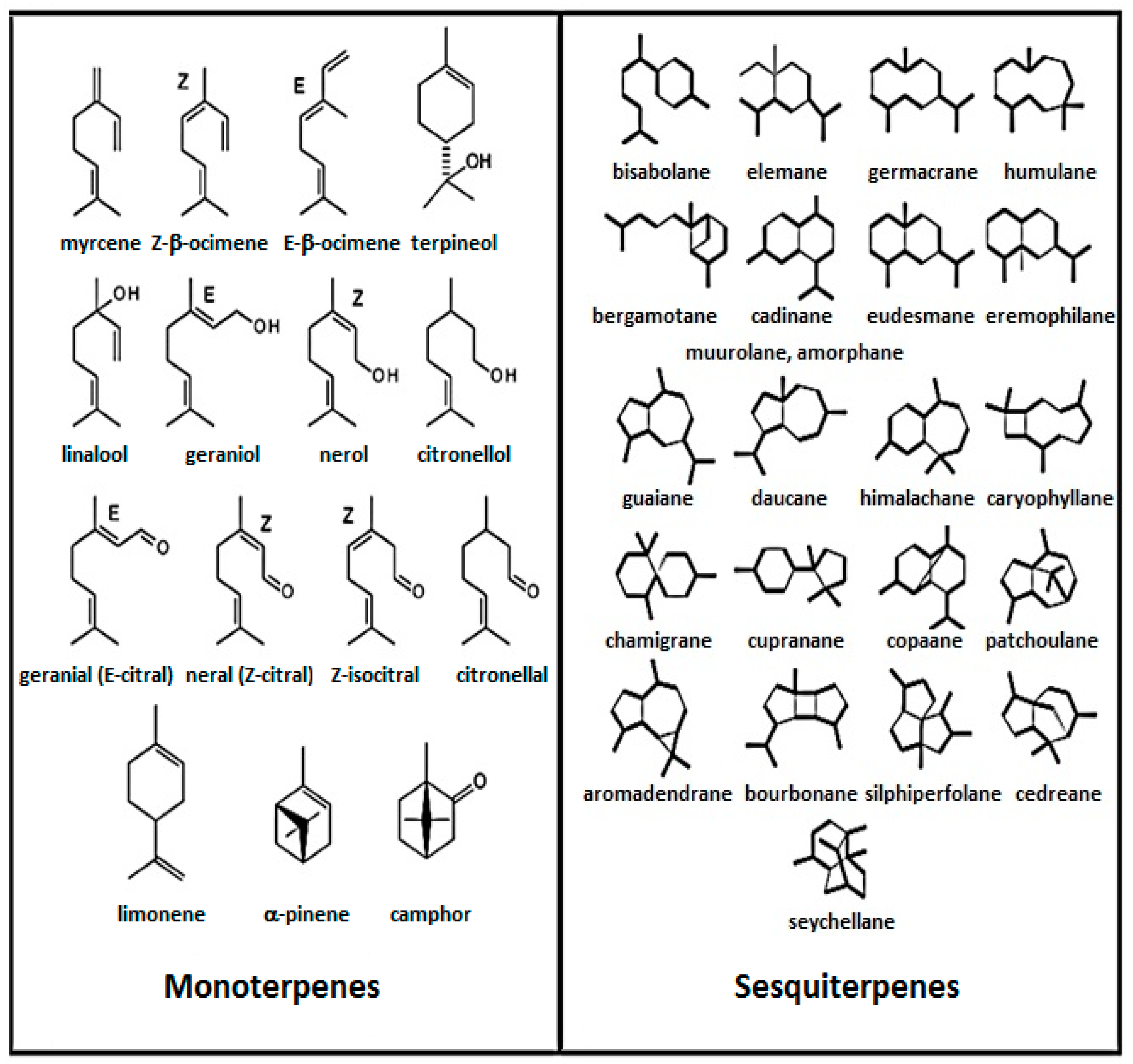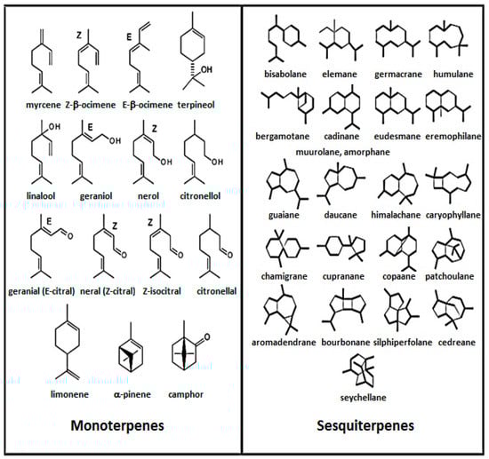 Furthermore, essential oil components belong mainly to the vast majority of the terpene family (Figure 1). Many thousands of compounds belonging to the family of terpenes have so far been identified in essential oils [7], such as functionalized derivatives of alcohols (geraniol, α-bisabolol), ketones (menthone, p-vetivone) of aldehydes (citronellal, sinensal), esters (γ-tepinyl acetate, cedryl acetate), and phenols (thymol).