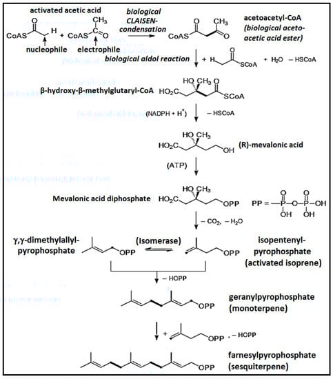 Biosynthesis pathways of monoterpenes and sesquiterpenes.