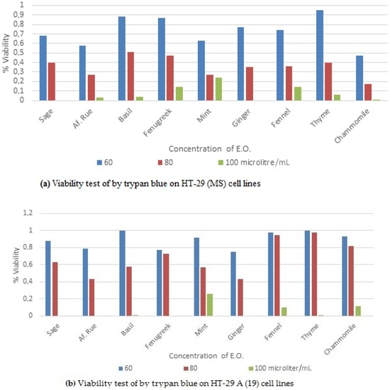 Viability test of both cell lines by trypan blue is shown in Figure 1a,b. HT-29 (MS) cell line viability decreased by 50% when 60 µL/mL of chamomile were used while all other EOs reached such a decrease when 70–80 µL/mL were used. In HT-29 19(A), 50% of viability was obtained when using 80 µL/mL of ginger and African rue, while all other EOs needed more than 80 µL/mL to reach such a decline in viability. However, apart from mint, all EOs produced 0% to 10% viability when concentrations were increased to 100 µL/mL.