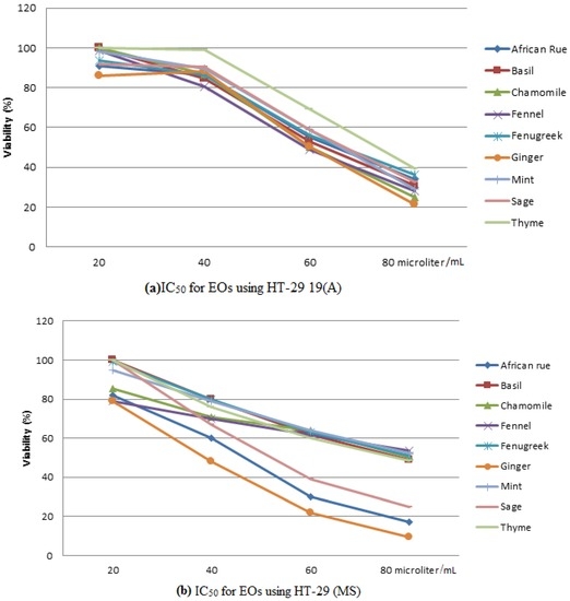 MTT assay using cell lines treated with EOs for 48 h: (a) IC50 on HT-29 19(A); (b) IC50 on HT-29 (MS).