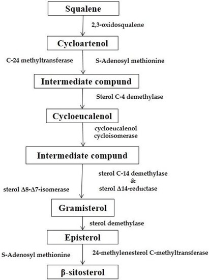 Both the biosynthesis of BS and Cholesterol follow the same direction till the formation of Squalene (Figure 4). However, the fate of Squalene varies due to the different target product. In the case of the biosynthesis of BS, Squalene forms cycloartenol through a cyclization reaction with 2,3-oxidosqualene. The double bond of cycloartenol is methylated by S-Adenosyl methionine (SAM) to give a carbocation that undergoes a hydride shift and loses a proton to yield an intermediate compound with a methylene side-chain. Both of these steps are catalyzed by sterol C-24 methyltransferase. The intermediate compound is then catalyzed by sterol C-4 demethylase and loses a methyl group to produce cyclo-eucalenol. Subsequent to this, the cyclopropane ring is opened with cyclo-eucalenol cyclo-isomerase to form another intermediate compound. This intermediate compound then loses a methyl group and undergoes an allylic isomerization to form gramisterol. This step is catalyzed by sterol C-14 demethylase, sterol Δ14-reductase, and sterol Δ8-Δ7-isomerase. The last methyl group is removed by sterol demethylase to form episterol. Finally, episterol is converted to β-sitosterol through methylation by SAM, reduction by NADPH, and modifications in the β-ring. Here 24-methylenesterol C-methyltransferase plays a very important role [40] (Figure 5).