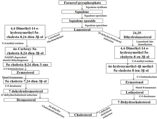 The synthesis of cholesterol occurs in three stages, with the first stage taking place in the cytoplasm and the second and third stages occurring in the endoplasmic reticulum. The stages are (1) Synthesis of isopentenyl pyrophosphate, the “building block” of cholesterol; (2) Formation of squalene via the condensation of six molecules of isopentenyl phosphate and; (3) Conversion of squalene to cholesterol via several enzymatic reactions [41] (Figure 6).