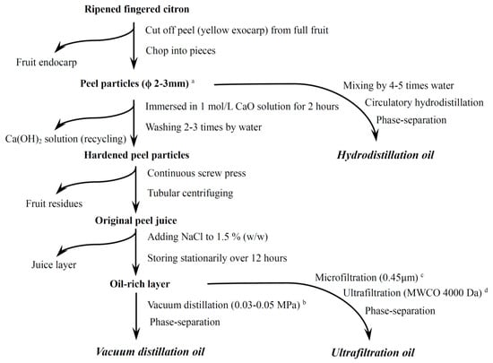 Scheme showing different isolation methods of essential oil from fingered citron fruits. a The average diameter of fruit peel particle is around 2–3 mm; b The absolute pressure in the vacuum is 0.03–0.05 MPa (absolute pressure); c The pore diameter of microfiltration is 0.45 μm; d The molecular weight cut-off (MWCO) of ultrafiltration is 4000 Da.