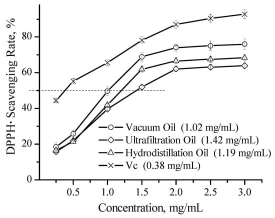 The antioxidant activity of essential oils is another biological property of great interest for potential utilization in cosmetic supplements or functional food products. The use of a DPPH· scavenging assay is the most routinely practiced method for the assessment of anti-radical properties of different samples. As shown in Figure 2, the antioxidant efficiency of the tested essential oils primarily relies on their concentration, and their free radical scavenging effectiveness was as follows, given in descending order and based on the increasing median inhibitory concentration (IC50) values: vacuum distillation oil (1.02 mg/mL) > hydrodistillation oil (1.19 mg/mL) > ultrafiltration oil (1.42 mg/mL).