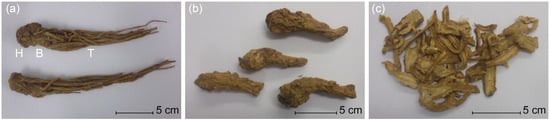 (a) Whole root of Angelica sinensis (Quangui) with head (H), body (B), and tail (T); (b) The combined head and body are nowadays commonly sold as head (Guitou); (c) Sliced dang gui (Guipian).