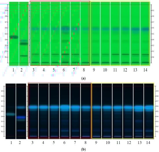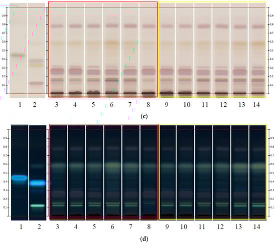 HPTLC fingerprints of Angelica sinensis cultivated in Gansu (tracks 3–8) and Yunnan (tracks 9–14). Isoimperatorin (Rf = 0.46), Imperatorin (Rf = 0.38), ferulic acid (Rf = 0.12), osthole (Rf = 0.33) and Z-ligustilide (Rf = 0.59) were used as reference substances. (a) Image of the plate prior to derivatization under UV 254 nm; (b) Image of the plate prior derivatization under UV 366 nm; (c) Image of the plate after derivatization under WRT; (d) Image of the plate after derivatization under UV 366 nm.