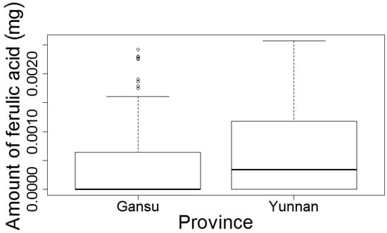 Amounts of ferulic acid of whole roots compared between Gansu and Yunnan Province. Error bars represent the 95% confidential intervals (Gansu, n = 111; Yunnan, n = 93).