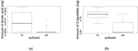 Ferulic acid and Z-ligustilide are significantly reduced in sulfured roots (Tobit regression for ferulic acid: (t (1) = 2.94, p < 0.001; for Z-ligustilide: t (1) = 2.98, p < 0.001; Figure 4; Data S2).